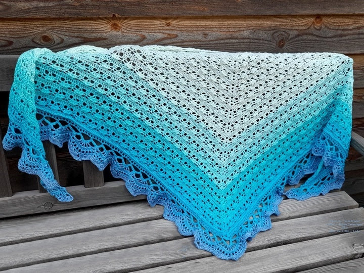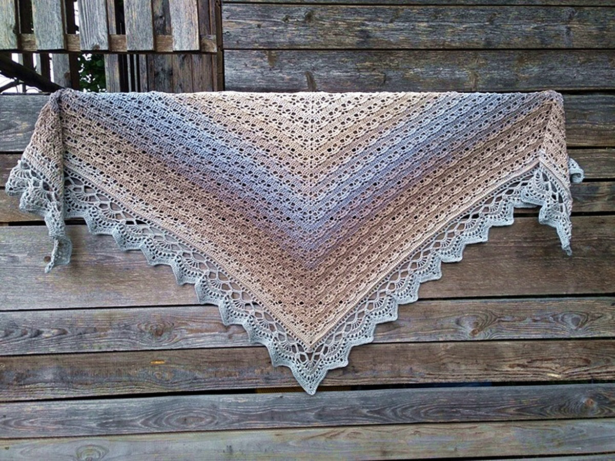 Tuch 2022 ist ein schlichtes Dreieckstuch mit einer wunderschönen Abschlussborte. Das Muster hat man schnell im Kopf und es kann in jeder beliebigen Größe angefertigt werden.