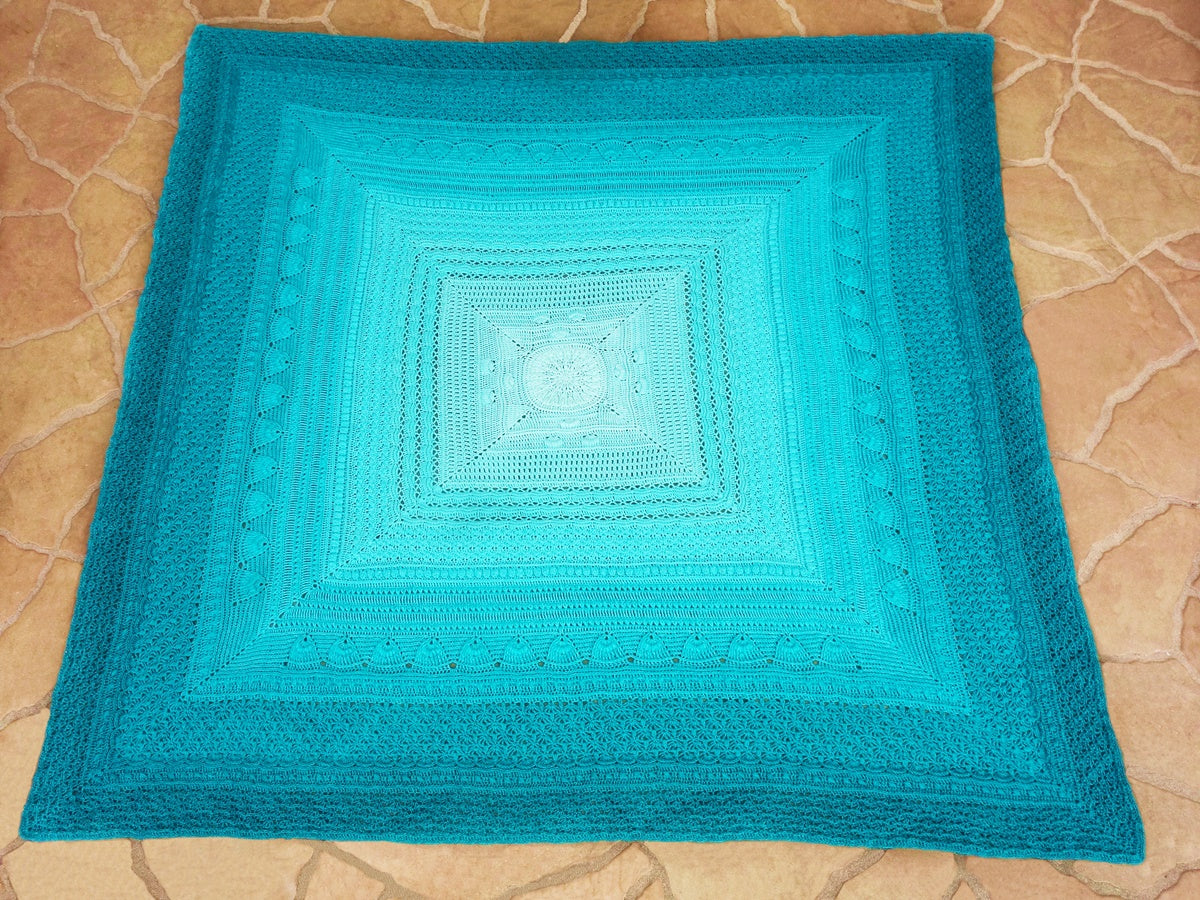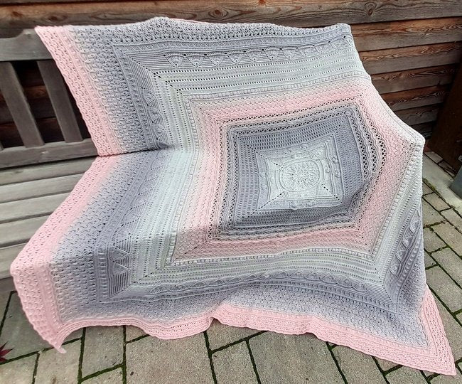 Diese wunderschöne, quadratische Decke wird komplett in Runden gearbeitet. Es ist also kein lästiges Wenden notwendig und somit ist sie perfekt für alle Farbverlaufsgarne geeignet.