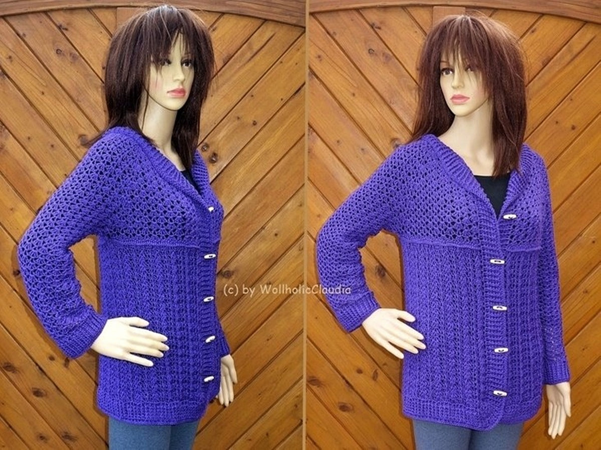 Sie wird in einem Stück von oben nach unten gehäkelt (Rvo), lediglich die Knopfleiste und die Ärmel werden später angehäkelt.