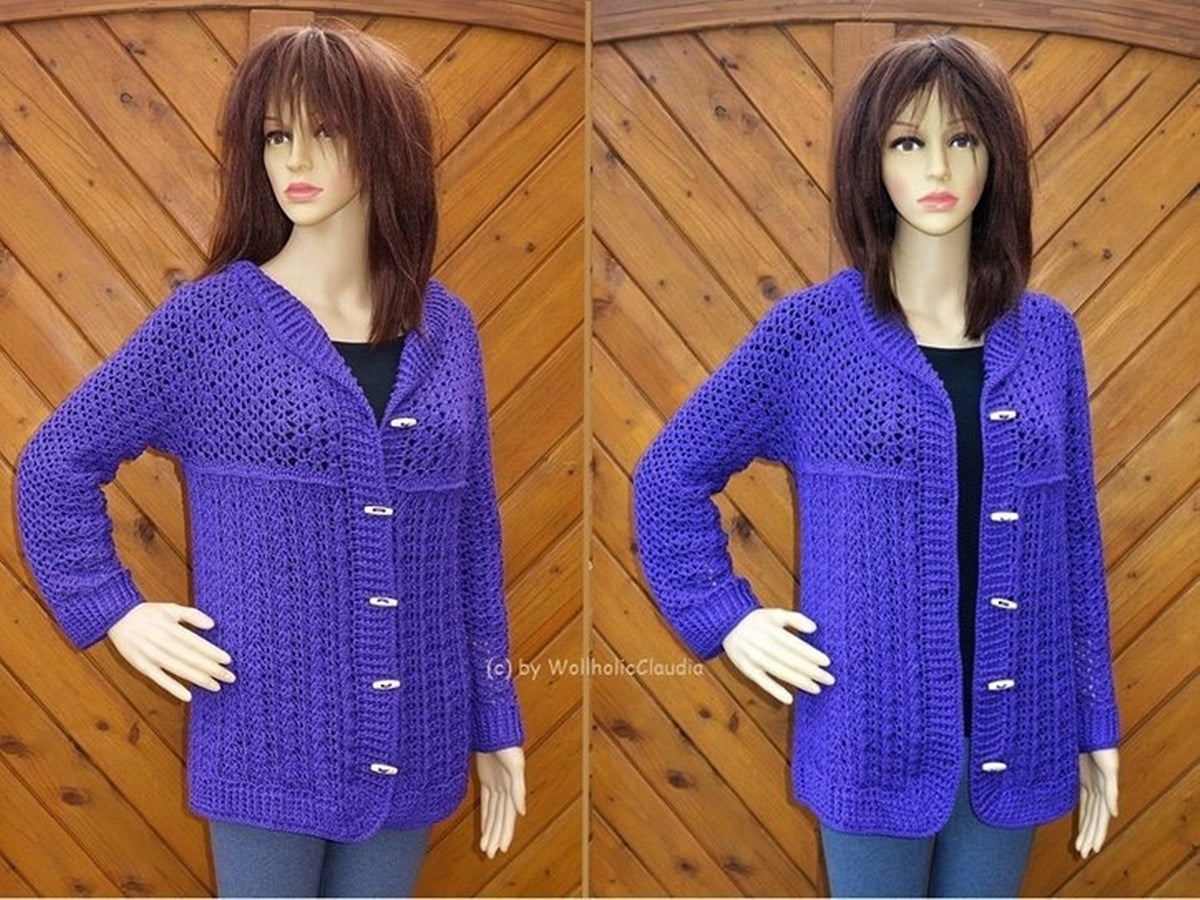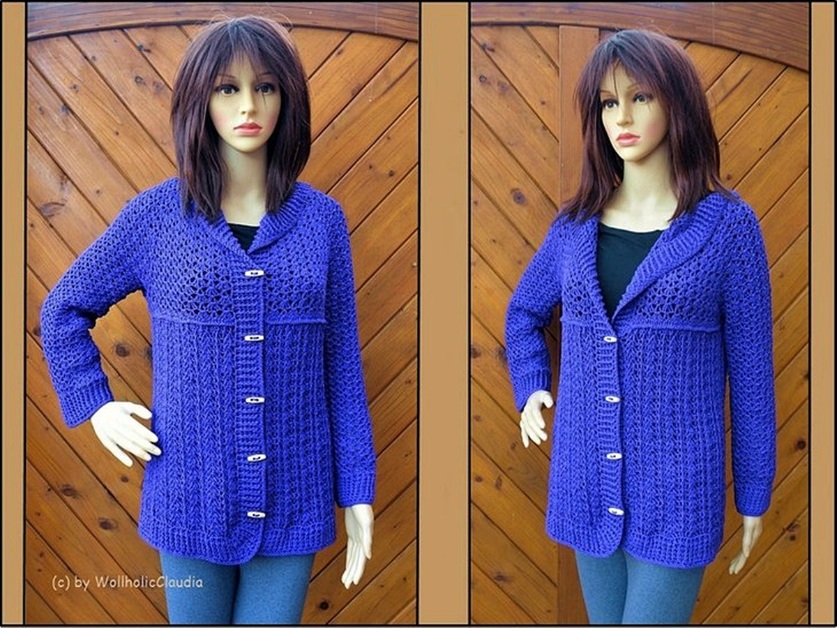 Diese tolle Jacke ist perfekt für den Übergang vom Winter zum Frühling/Sommer. 2 unterschiedliche Muster trennen den oberen Jackenteil vom Unteren. Die Weite, Ärmellänge und Jackenlänge kann man individuell anpassen. Auch Anfänger mit etwas Durchhaltevermögen können sich diese stylische Häkeljacke anfertigen.