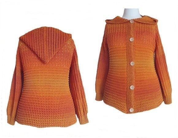 Sie kann in jeder beliebigen Damengröße gehäkelt werden und auch ambitionierte Anfänger sollten mit der sehr ausführlichen Anleitung zurecht kommen. In einem Stück von oben nach unten gehäkelt (Rvo), lediglich die Knopfleiste und die Ärmel werden später angehäkelt, also keine Seitennähte.