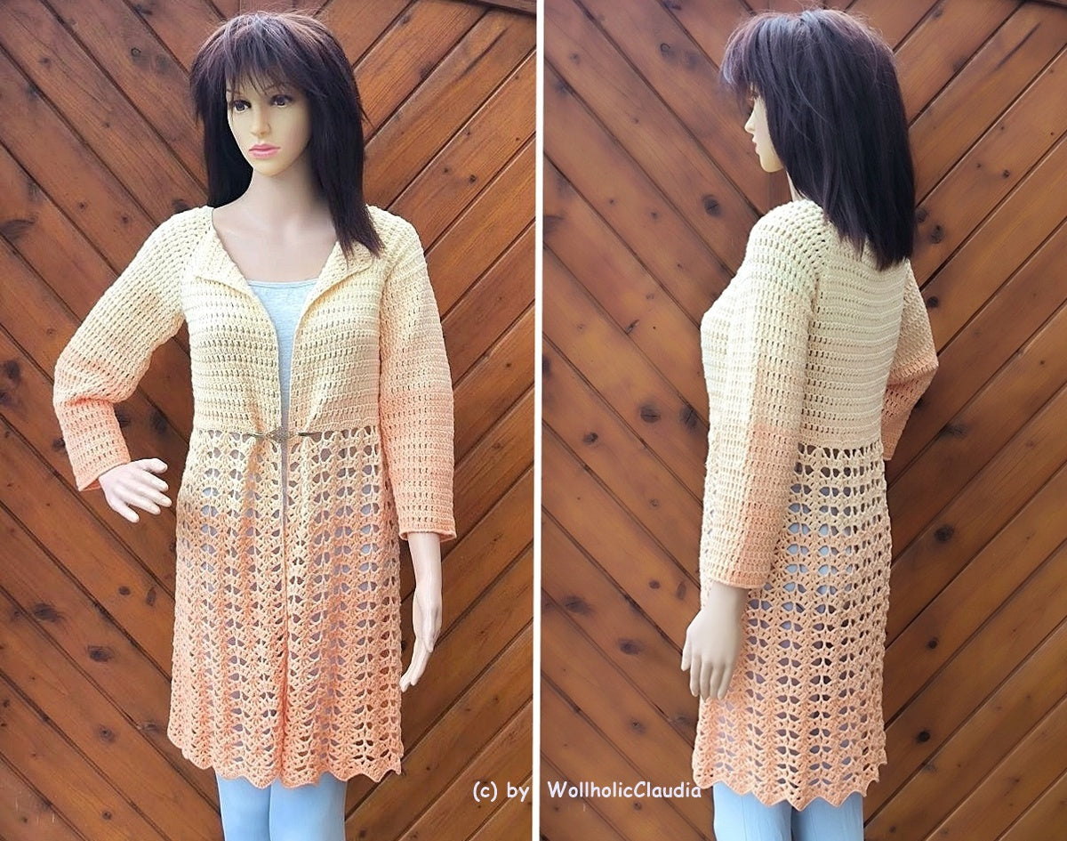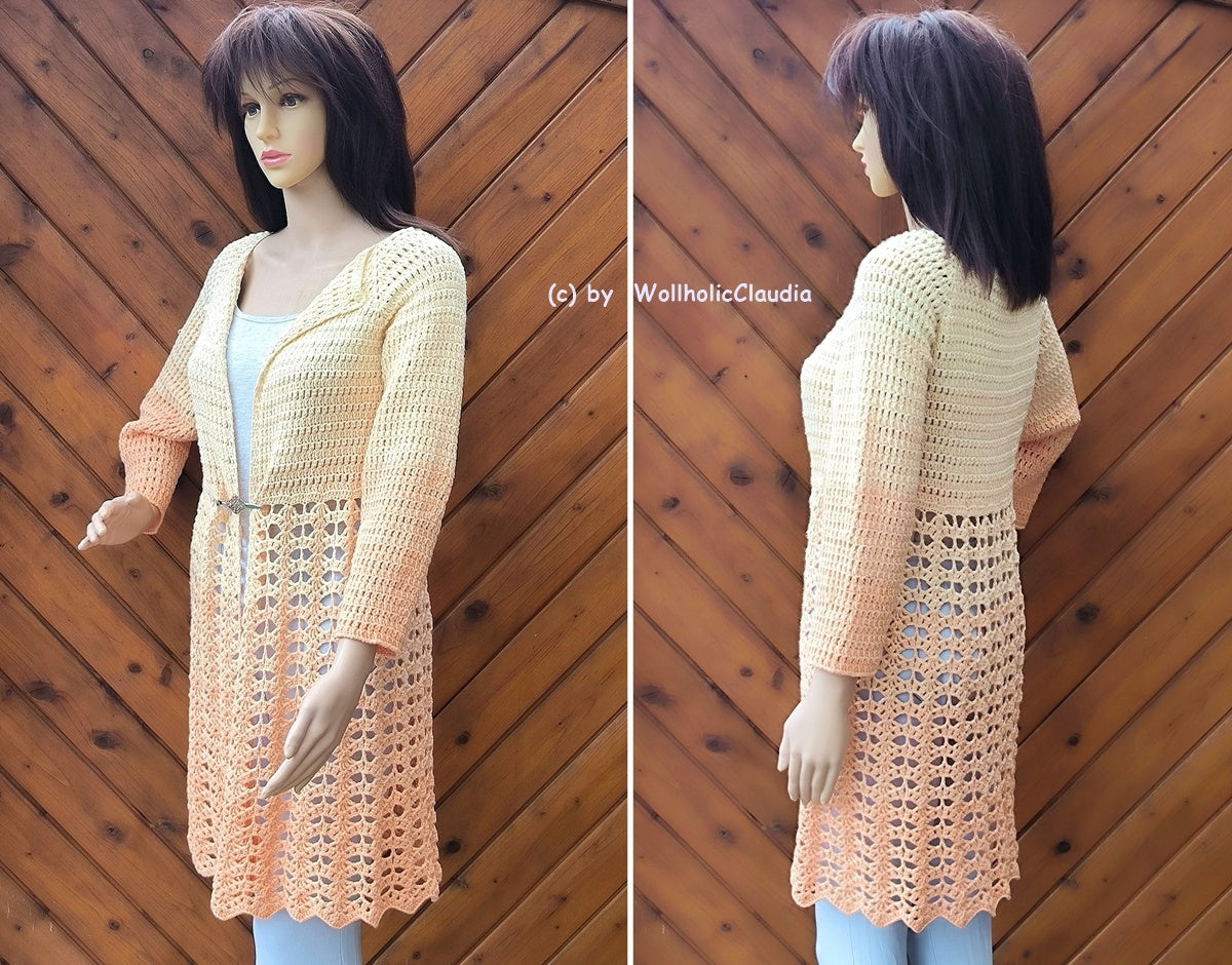 Die Anleitung ist wie immer schriftlich und natürlich sind auch die nötigen Häkelschriften dabei. Die Jacke ist in jeder Größe und Länge machbar. Alle Maße können individuell angepasst werden.