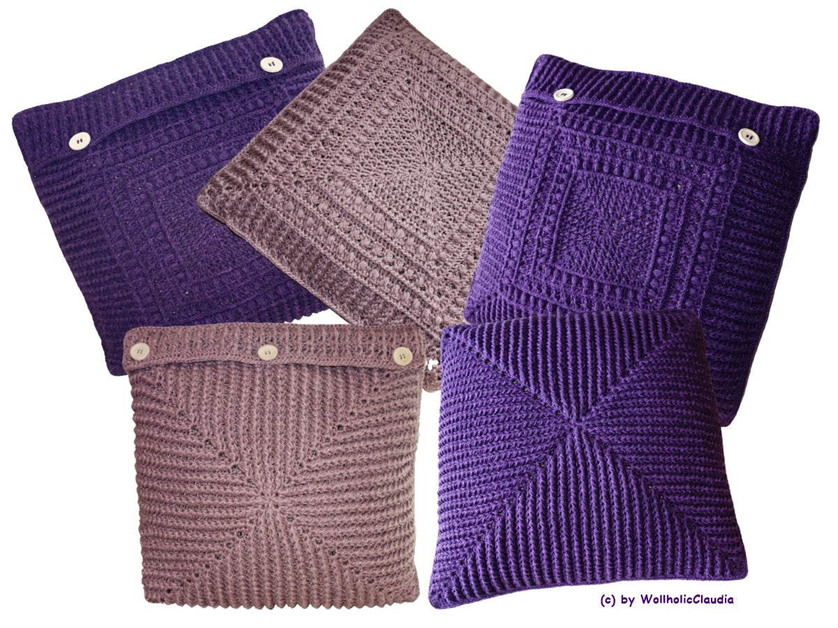 Hier hat man die Möglichkeit, 2 unterschiedliche Musterseiten zu gestalten oder beide Kissenhälften identisch zu arbeiten. Geschlossen werden sie mit einer Knopfleiste, die man beliebig lang machen kann.