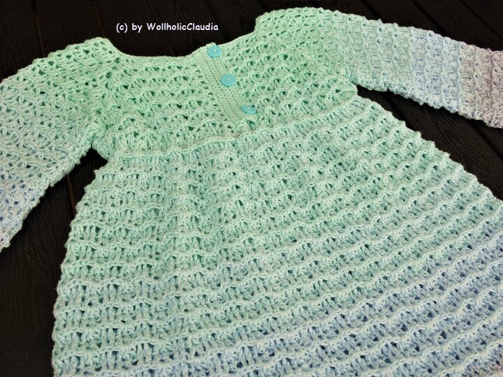 Ob für den Winter mit langen Ärmeln oder im Sommer mit Kurzarm, dieses Kleidchen kann man individuell anpassen. Das Kleid wird an einem Stück von oben nach unten gearbeitet (Raglan von oben) und ist somit perfekt geeignet für Farbverlaufsgarne. Im Rücken ist eine Knopfleiste eingearbeitet.