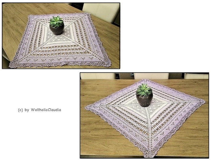 Diese wunderschöne Mitteldecke namens "Frühlingserwachen" macht jeden Tisch zu einem Blickfang, egal ob schlicht einfarbig- oder wie hier, mit zarten Farbverlauf. Bei angegebener Garn- und Nadelstärke ist die Mitteldecke ca. 80 cm x 80 cm groß.