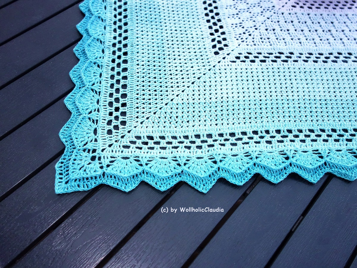 Eine Tischecke, die richtig Lust auf Frühling und Sommer und Strand macht. Ob auf dem Esstisch oder wie hier auf dem Gartentisch, sie ist ein toller Hingucker. Du kannst sie mit jedem beliebigen Garn und der dazupassenden Nadelstärke anfertigen. Ebenso kann man die Größe individuell anpassen.