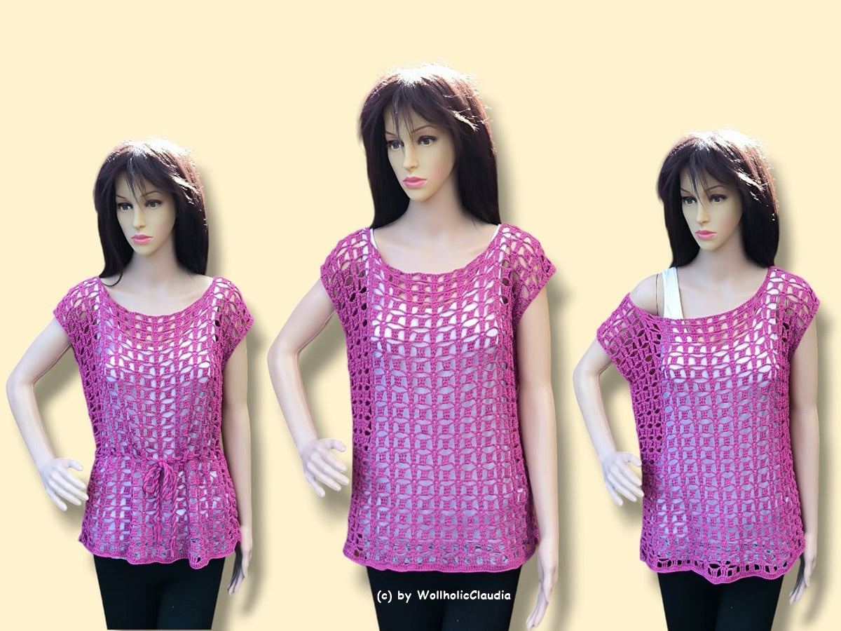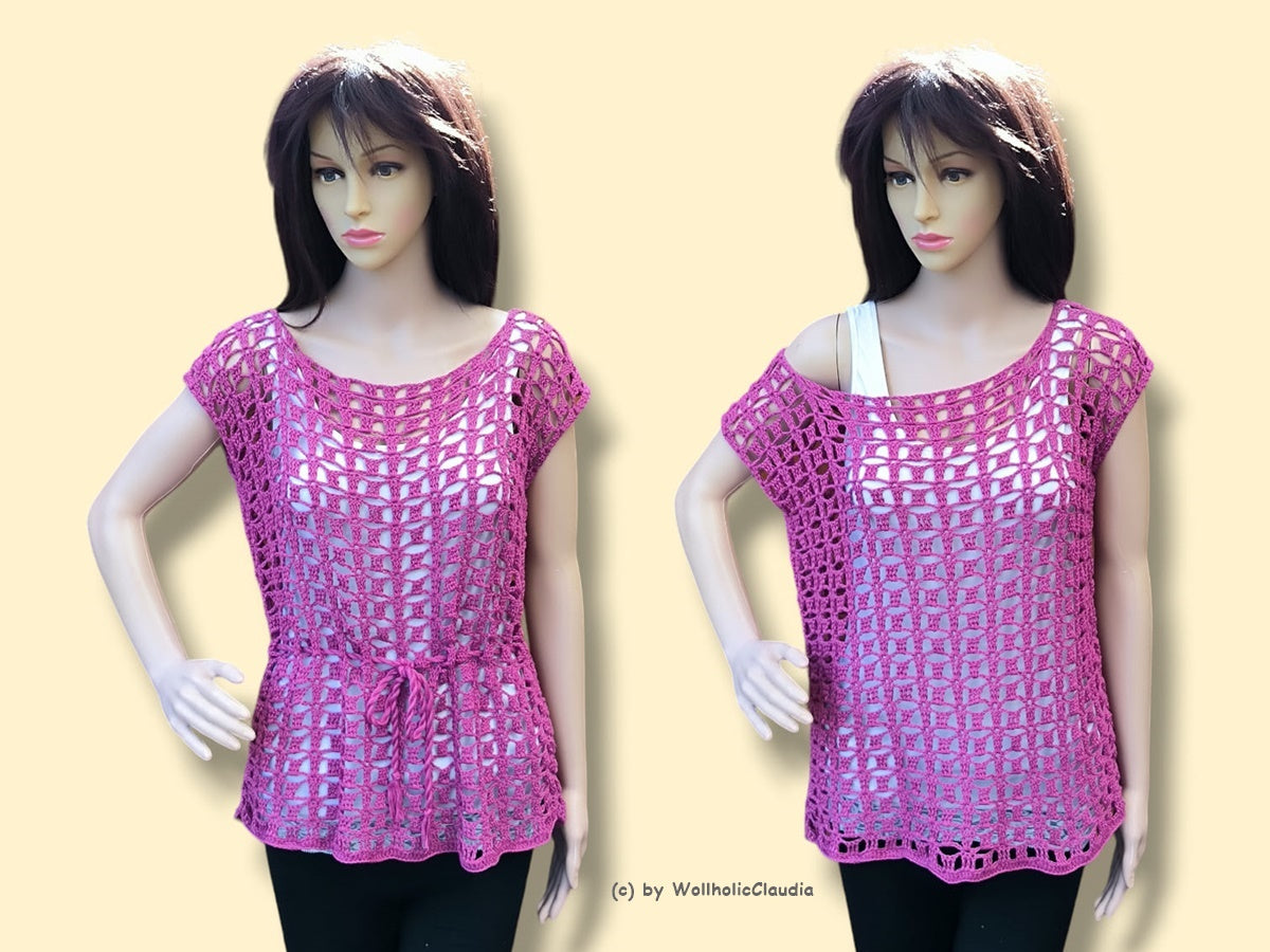 Dieses hübsche, luftige Top ist ein toller Hingucker und relativ schnell gehäkelt. Du kannst es ganz individuell deinen Maßen anpassen, alles wird genau erklärt. Man kann es mit Kordel als Tunika oder lässig als Shirt tragen.