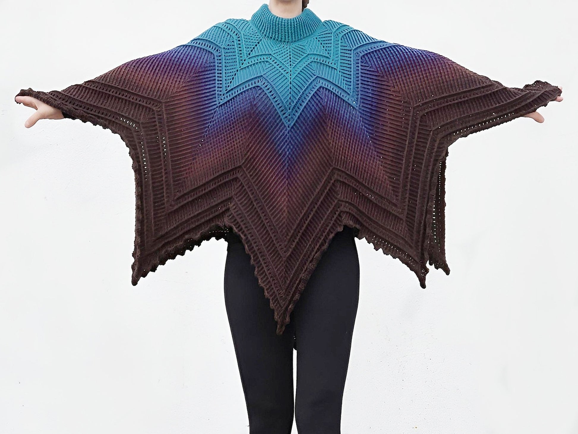 Poncho "Abendstern", ist außergewöhnlich in seiner Form. Ganze 8 Spitzen sorgen für viel Bewegungsfreiheit. Es macht nicht nur Spaß ihn zu häkeln, er sieht auch noch toll aus. Man kann ihn in jeder beliebigen Größe, Garn- und Nadelstärke anfertigen.