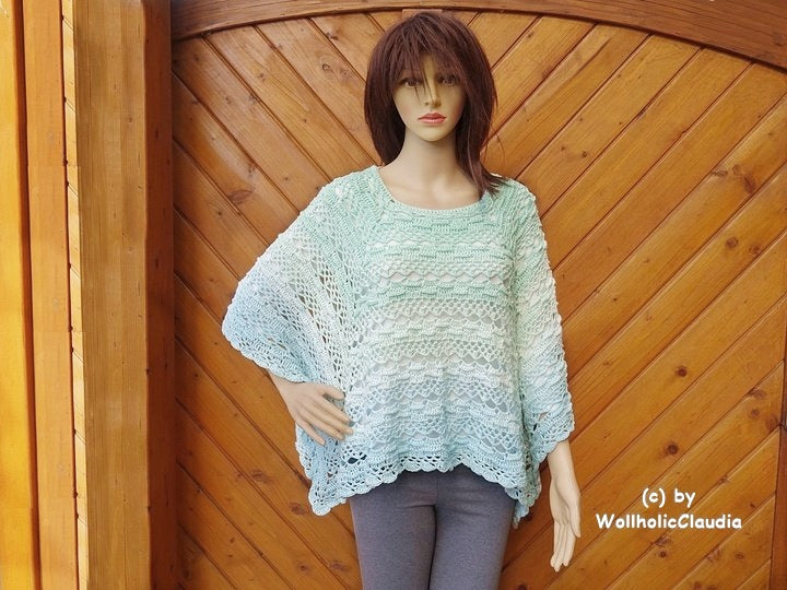 Der Poncho "Adria" ist ein moderner Poncho mit einem sich immer wiederholenden Muster. Du kannst ihn in jeder beliebigen Größe, beliebigen Garn und Nadelstärke anfertigen.