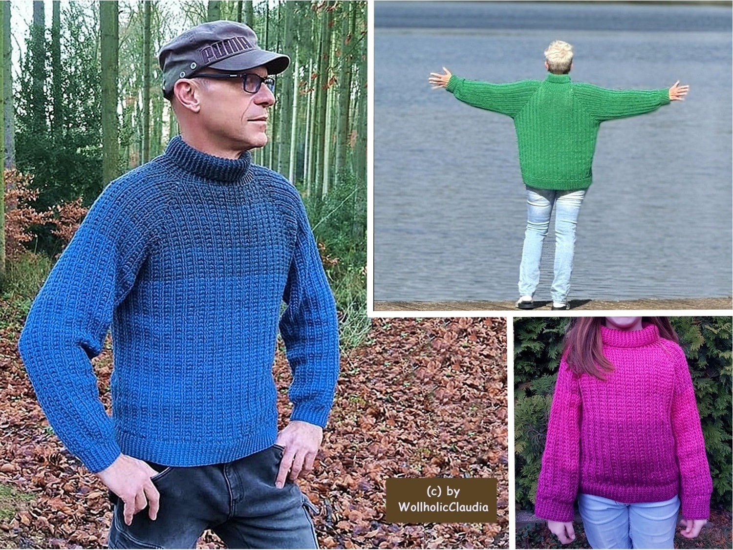 Ein Pulli für die ganze Familie, er ist in jeder beliebigen Größe machbar und sogar von beiden Seiten tragbar. Der Pulli wird von oben nach unten gearbeitet (Rvo).
