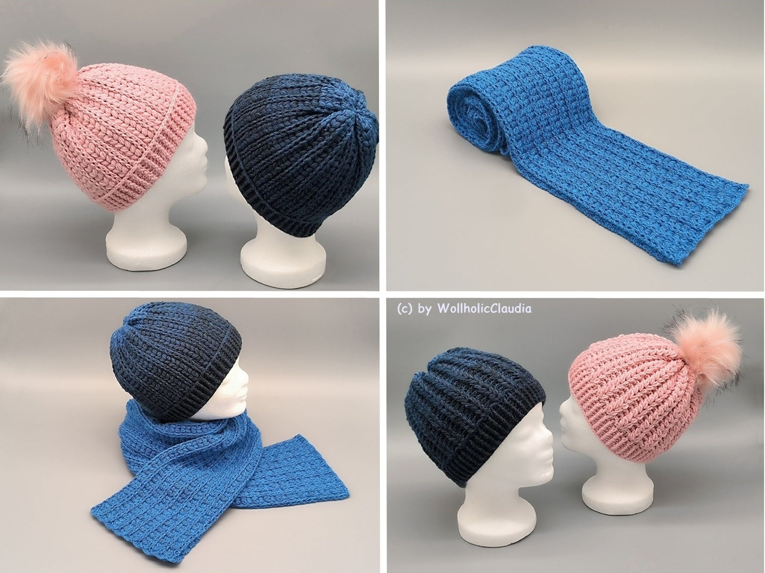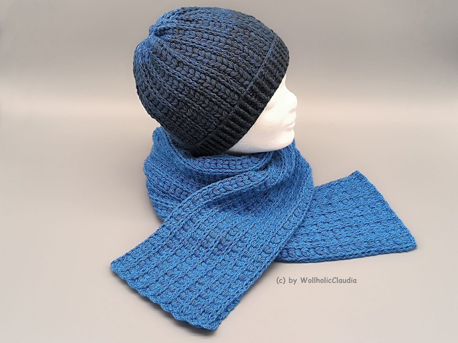 Hier nun auch als Set bestehend aus Mütze und Schal. Es besteht aus einem relativ einfachem Muster und kann sowohl von Herren/Jungen als auch von Damen/ Mädchen getragen werden. Die Mütze sowie auch der Schal sind natürlich individuell in der Länge bzw. der Größe/ Breite und mit jedem beliebigen Garn und der dazu passenden Nadelstärke machbar.