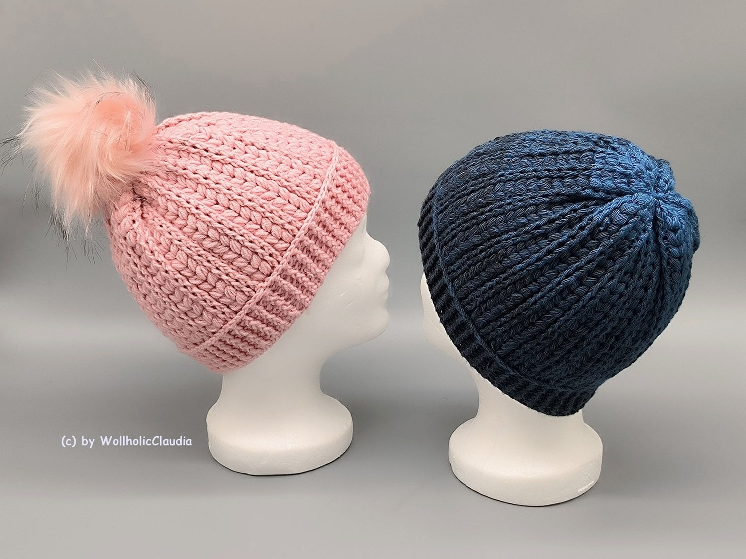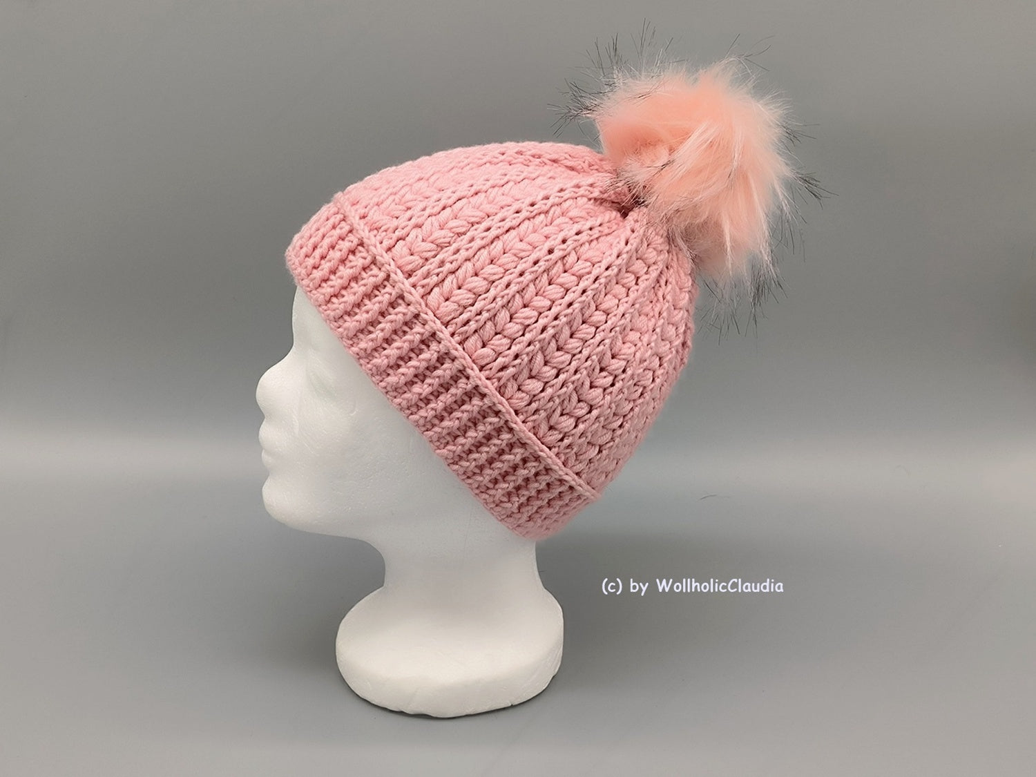 Beispiel hier Mütze rosa: KU = 54 cm, Mützenhöhe = ca. 17,5 cm.