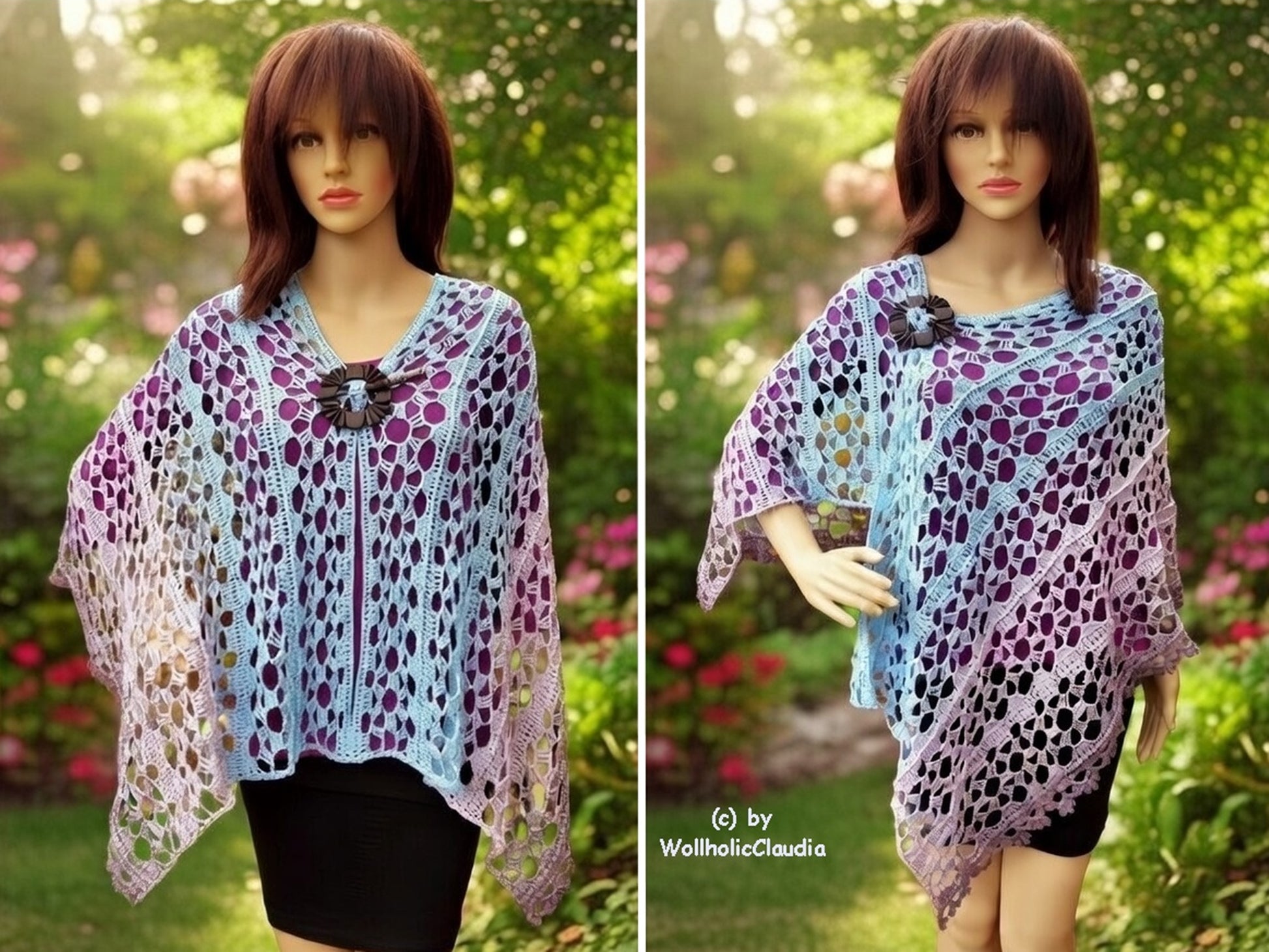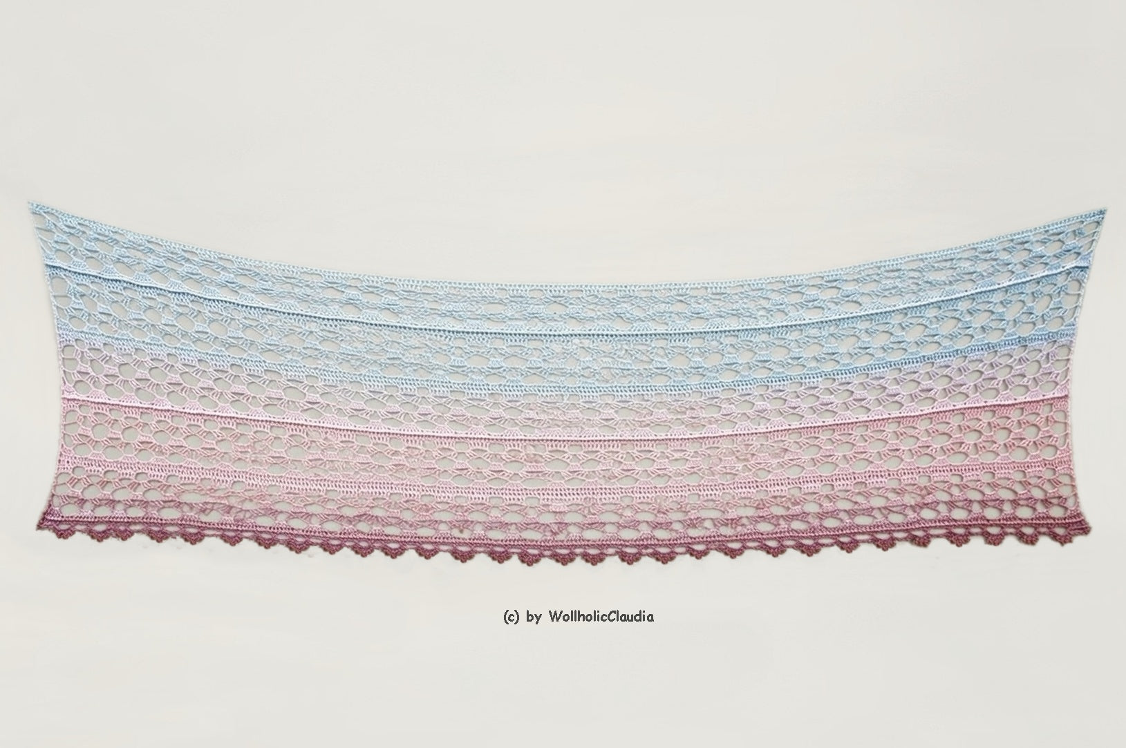 Diese gehäkelte Stola namens "Blütentraum" hat ein sehr luftiges Muster und ist perfekt für den Sommer. Auch für Hochzeiten oder andere festliche Gegebenheiten. Das Muster ist beidseitig tragbar, ob als Schal, Tuch, Stola oder Überwurf, hier sind viele Tragevarianten möglich.