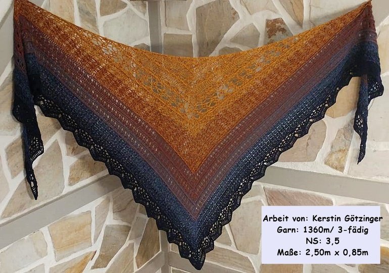 Bei angegebener Garn- und Nadelstärke hat das Tuch nach dem Spannen die Maße von ca. 2,45m x 0,90m.