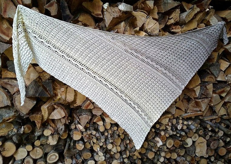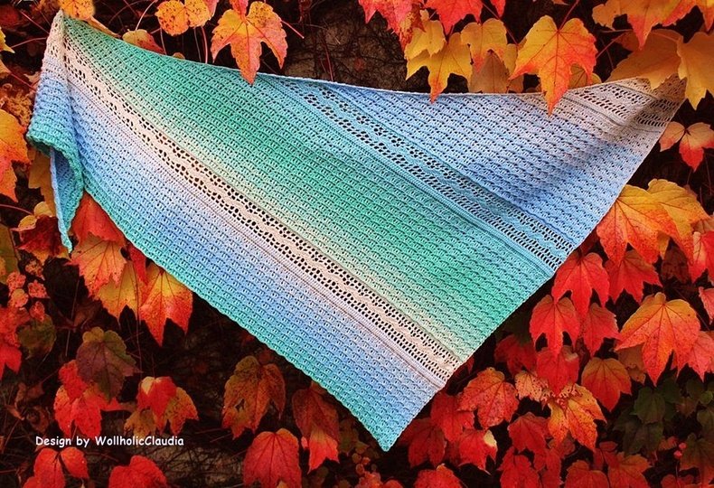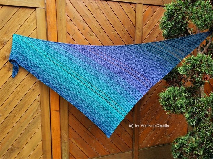 Dieses asymmetrische Tuch ist ein absoluter Hingucker. Es kann in beliebiger Größe und mit jedem Garn und der dazu passenden Nadelstärke angefertigt werden. Ich empfehle allerdings mindestens 1200m, damit es eine akzeptable Größe hat.