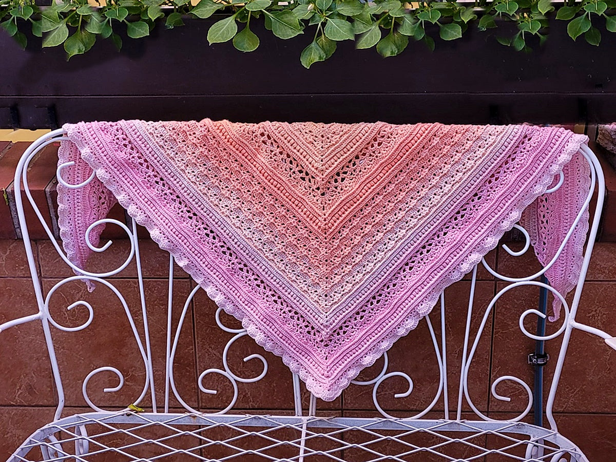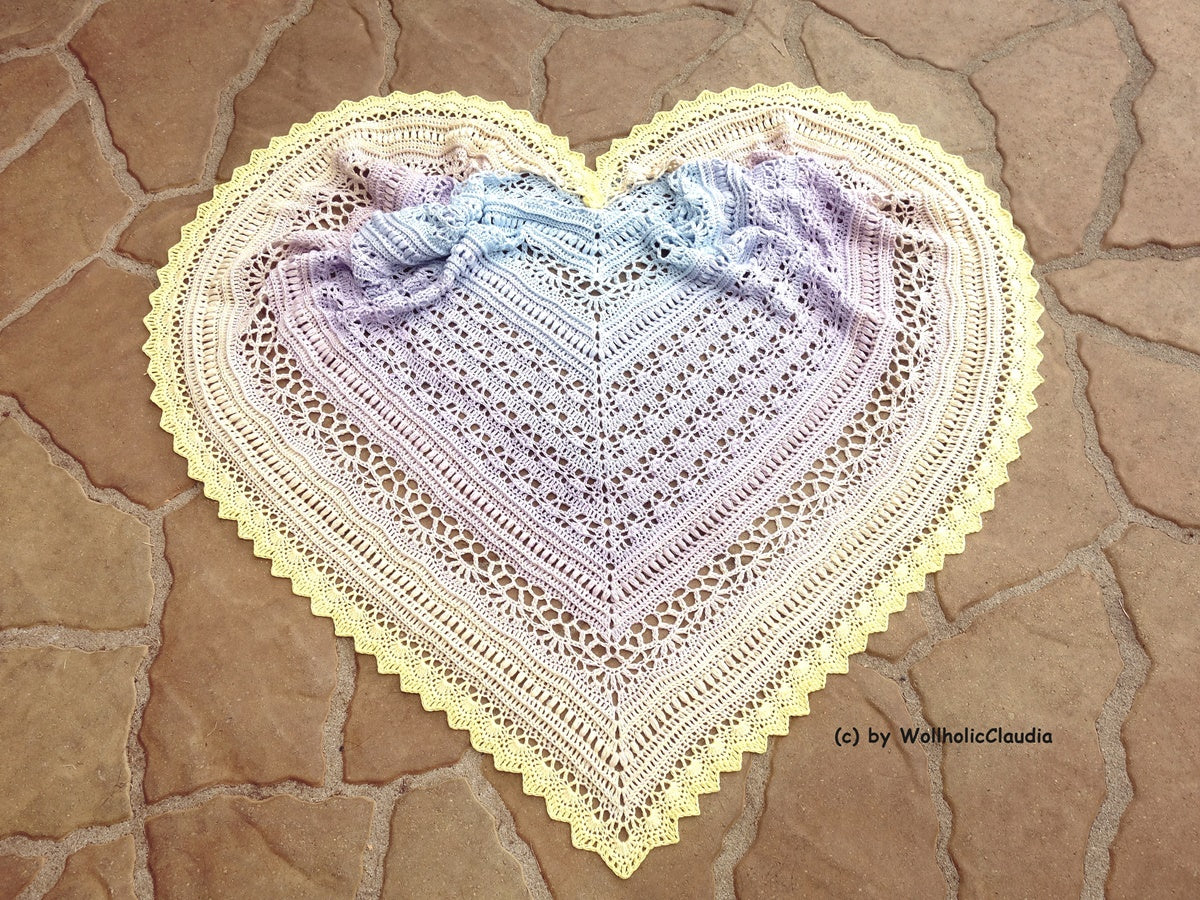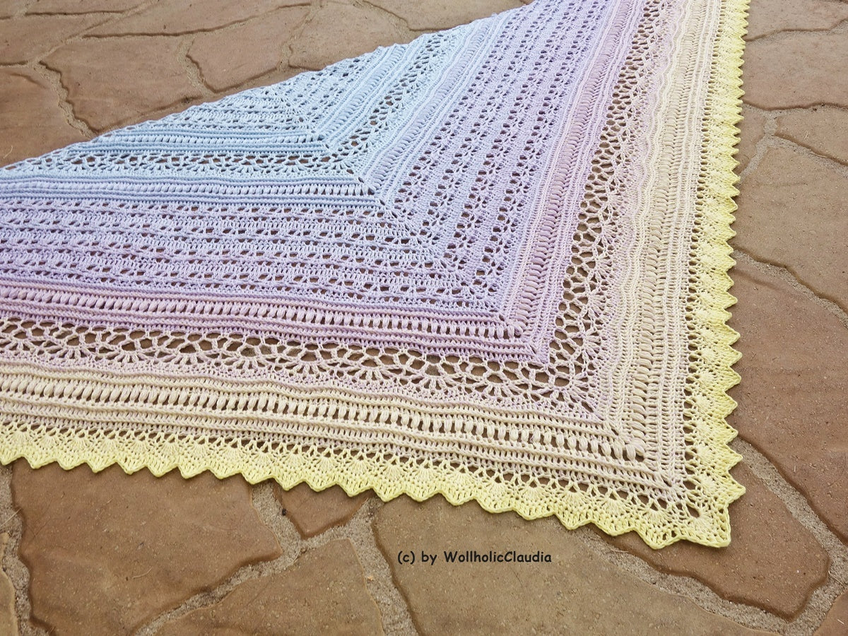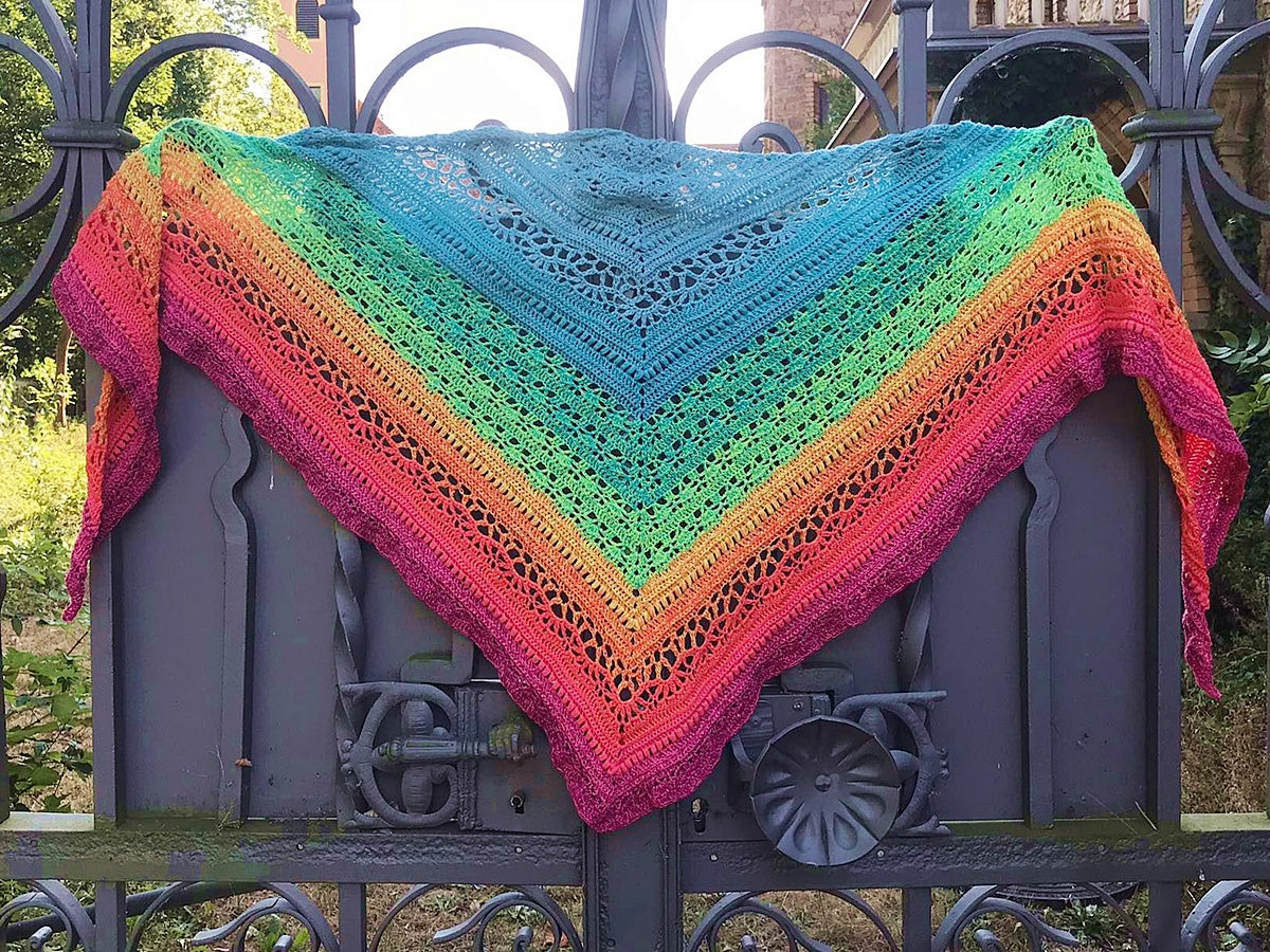 - ca. 1550m/ 4-fädiges Farbverlaufsgarn → Größe: 2,05m x 0,90m (gespannt)