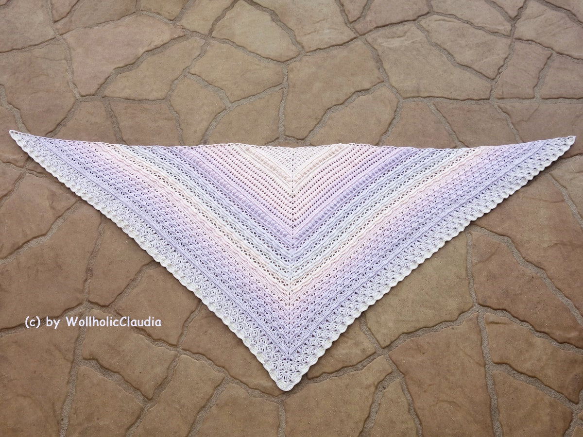 Das Tuch kann im letzten Muster noch beliebig erweitert werden, sodass kein Garn übrig bleiben muss.