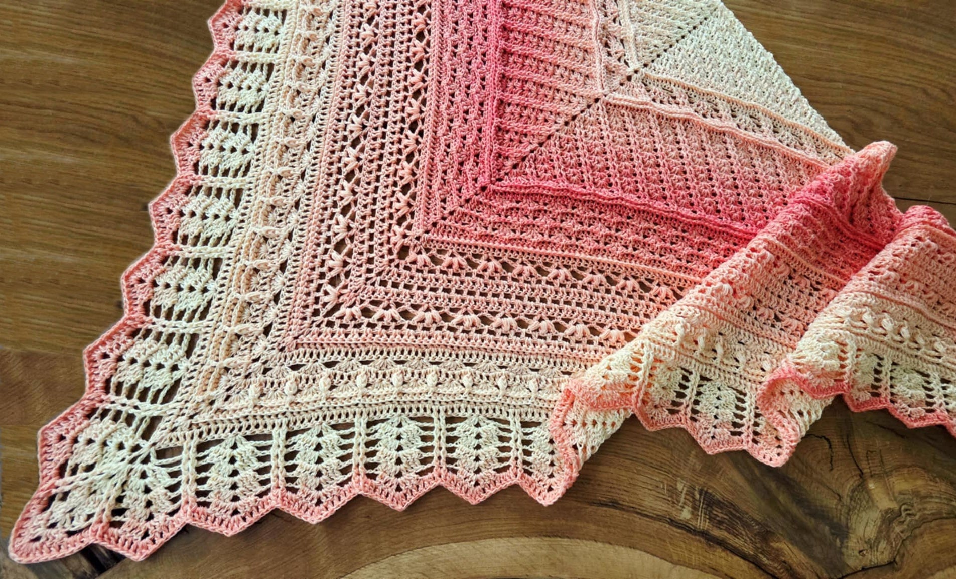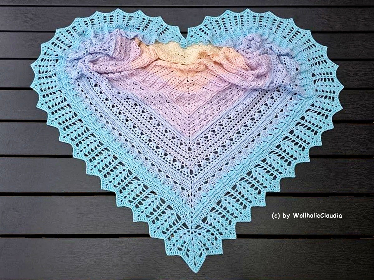 Dieses Tuch besteht aus insgesamt 68 Reihen die in 7 tolle Muster aufgeteilt sind.